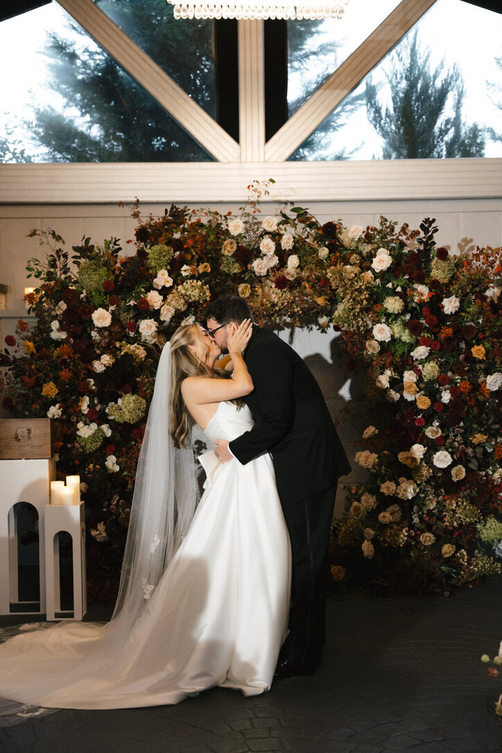 The ceremony was enveloped in rich texture and candlelight, where velvety blooms in deep burgundy, rust, and chocolate tones framed the couple beneath the industrial-romantic glow of the venue.
