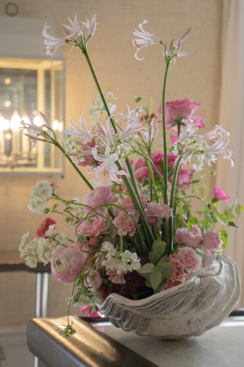 Tablescapes featured coastal-inspired linens and napkins, styled with precision and warmth. Oyster shells became delicate vessels for pin-frog arrangements — a subtle nod to the ocean just beyond the windows. A floral divider framed the band, creating an artful transition between music and movement, while the cake meadow and bar installations bloomed with sculptural statement pieces set within oversized shells.
